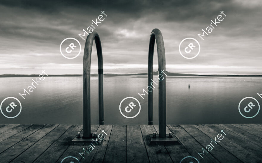 A calm body of water on a beautiful morning out on Murrays Bay. The black and white, and the sky is filled with moody clouds, and the dark grey railing against a serene ocean