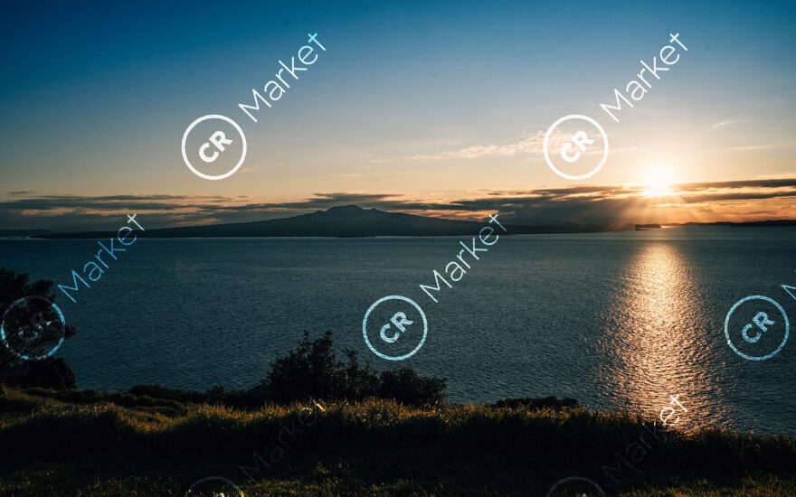 An early morning hike up North Head Devonport to capture sunset over the ocean. Rangitoto on the horizon with a lovely blue sky with sun casting a nice glow on the water ,plus the sun silhouette of a grass and bushes