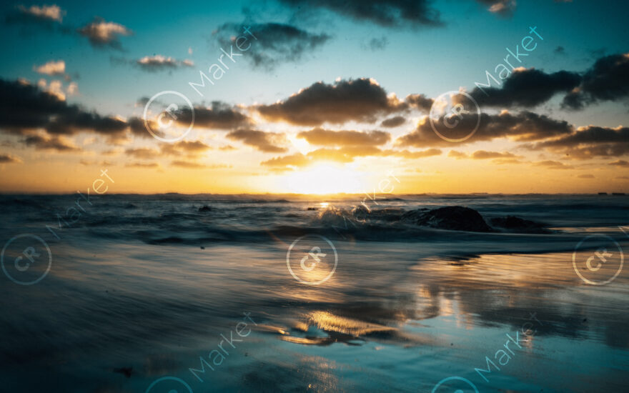 Love the way this long-exposure photograph risk paid off, capturing a sunset over the ocean with light bursting through and the clouds casting a warm glow, and waves captured in full motion hitting some rocks. Some blue and orange tones in the sky tying it all together