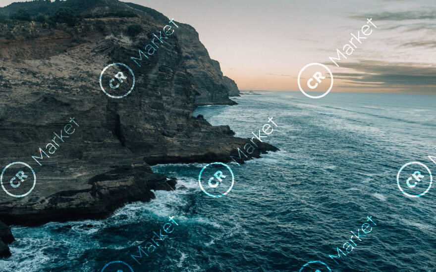 An aerial snap at Piha ,capturing a rugged cliff , crashing waves highlighted against a light hazy and moody. sky