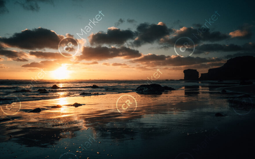 This captures a dramatic sunset at Muriwai, with the sun casting a brilliant orange and yellow glow across the water. The dark, moody clouds with deep blue tones stretched across the sky. The waves rolling against the large rocks cast beautiful reflections