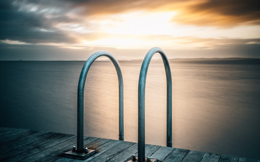 A long-exposure photograph captures calm water at sunrise over Murrays Bay. The handrails, forming an archway-like shape, look over the water, reflecting the vibrant golden-orange light breaking through the dark clouds on the horizon and bring some drama to the clouds