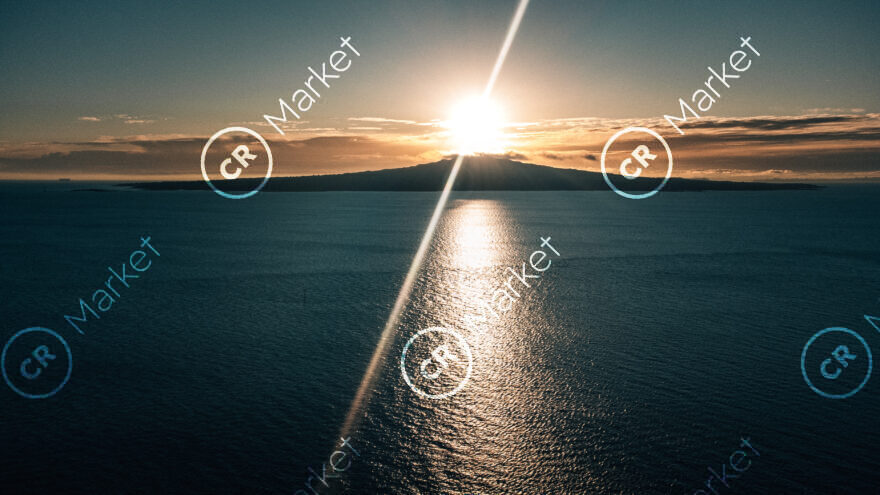 A Sunrise capture of Rangitoto Island ,getting the intense sunlight and some reflections on the calm dark ocean against scattered clouds in the background