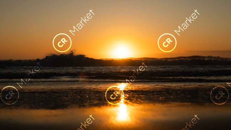 A different view shot against sunset , wave crashing , silhouetted against the golden sun with a clear sky above ,and orange golden hues